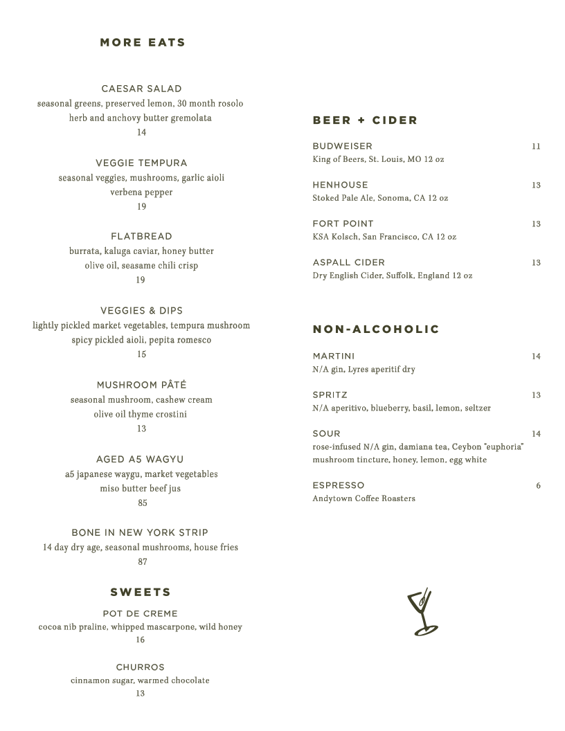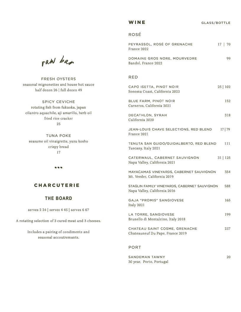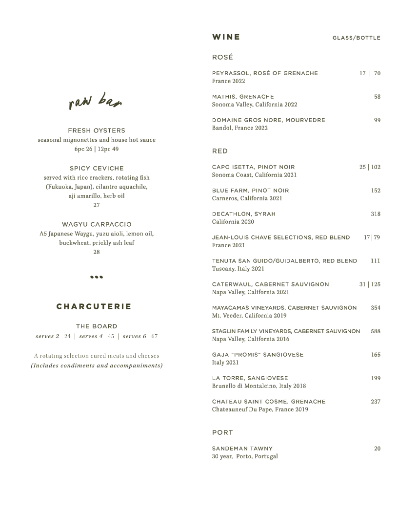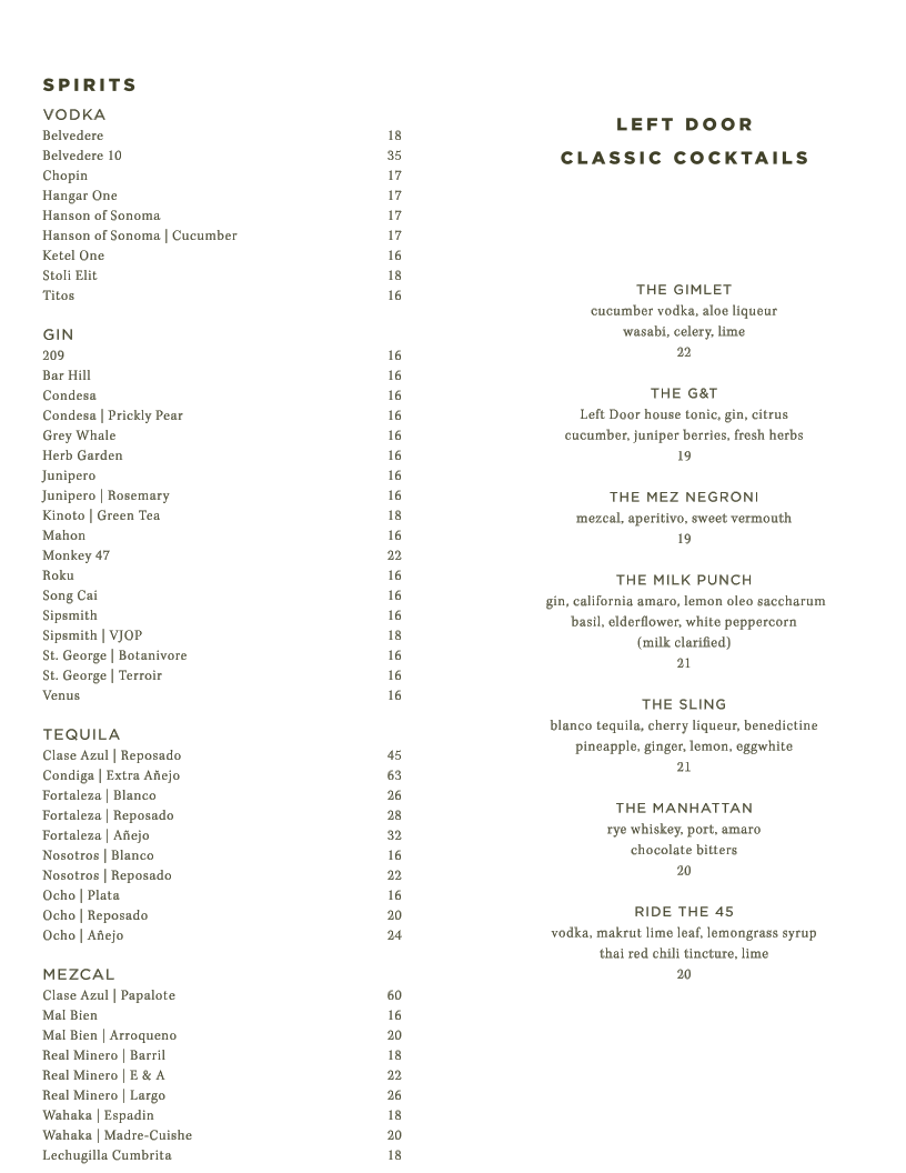 Left Door, located at 1905 Union St in San Francisco, offers a diverse and tantalizing menu perfect for those seeking a balance of sophisticated bites and casual indulgence. Whether you're enjoying a pre-dinner snack or savoring a full meal, there's something for everyone.