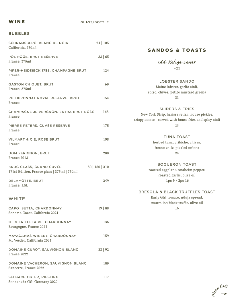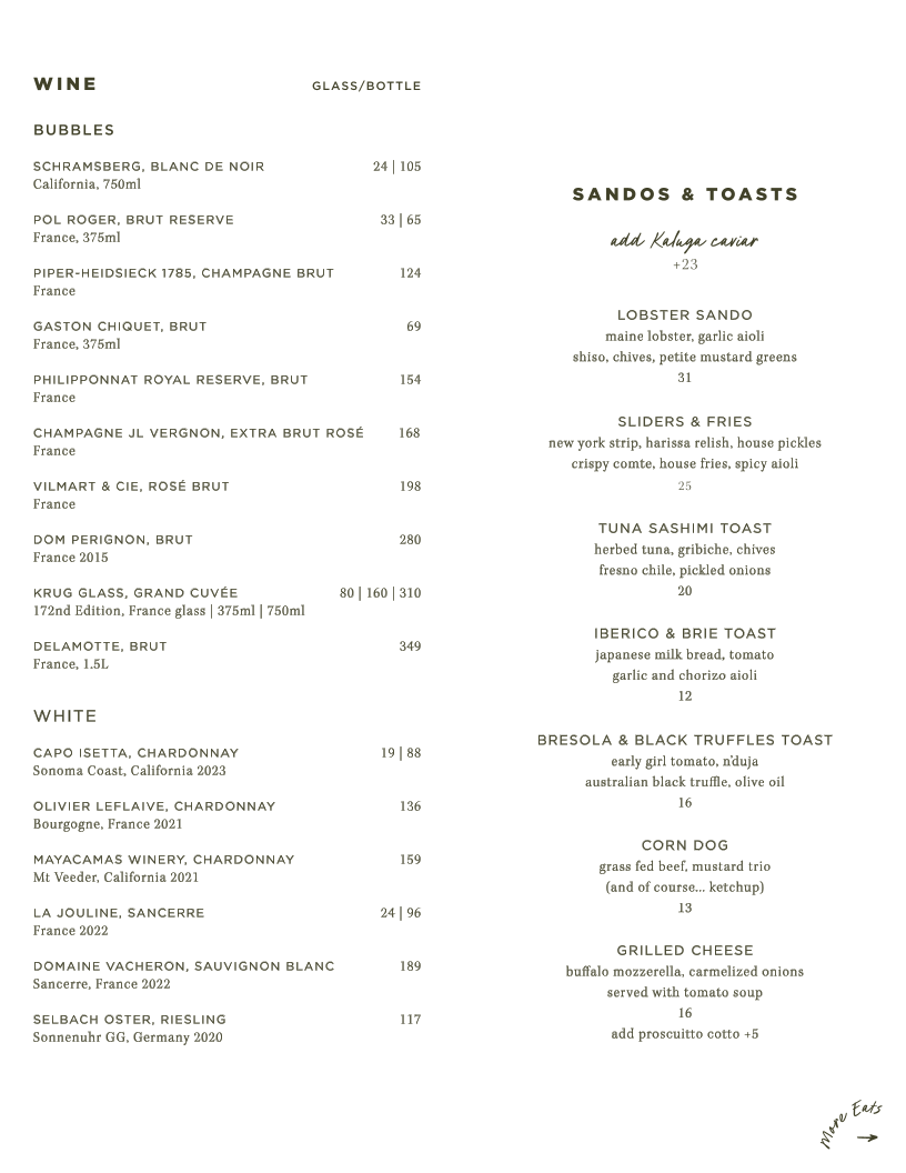 Overall, Left Door's menu is a celebration of bold, fresh ingredients and creative flavors. From luxurious bites like caviar to comforting sliders and fries, there's something on offer for every palate, making it a destination worth visiting in San Francisco.